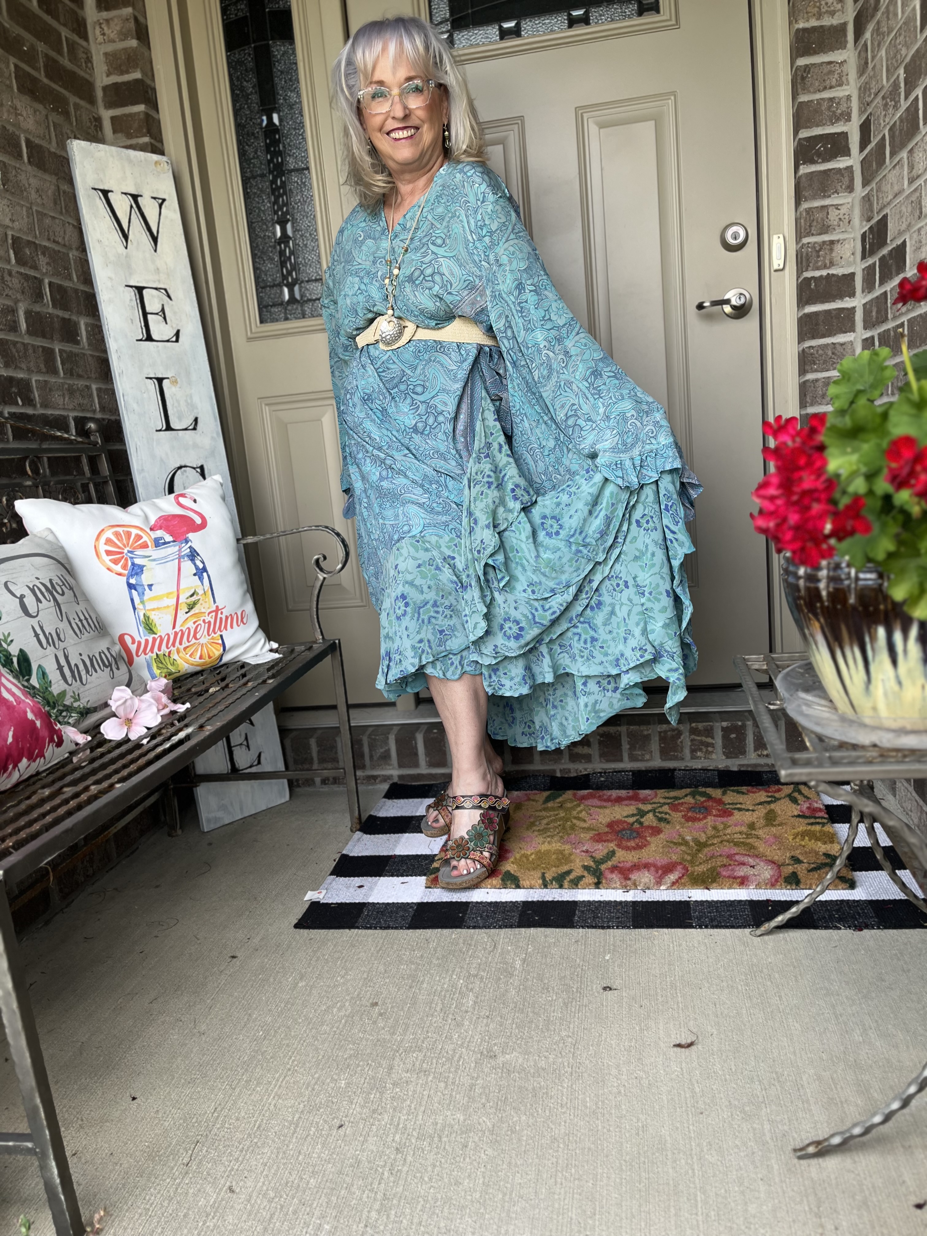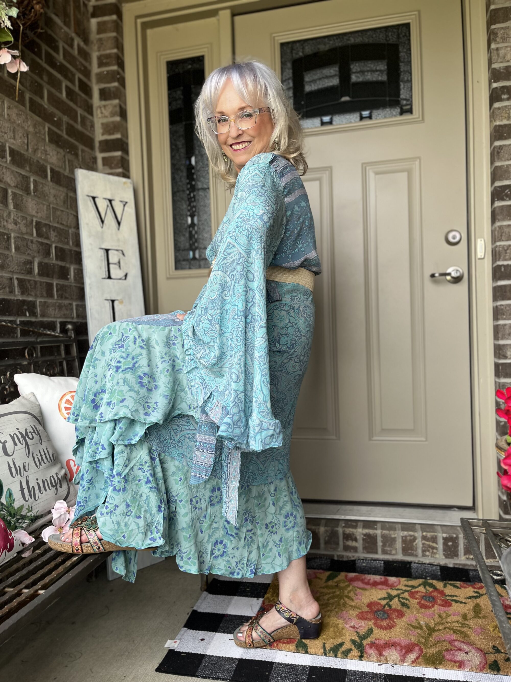 I don’t think you failed on this challenge at all! I love this Kantha Bae dress so much even that wonky piece. It gives it a unique character! The print and colors are gorgeous and I love those sandals. I actually focused more on the greens and browns than the blues so I really like that your outfit is so different from mine. That is the fun of these art challenges! I am looking forward to your next art pick, my friend!