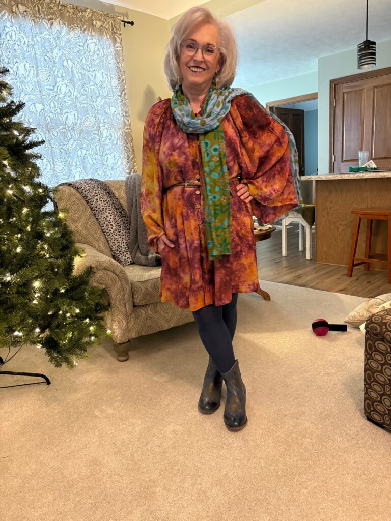 This is a stretch, I know! I had thought to wear an April Cornell dress in brown with lots of beautiful roses on it. But, as always seems to happen, when I looked again at the painting, I realized the Hesperides were wearing garments lacking a print. So, that sent me back to the closet with just the colors of the dresses in mind. And, that, my friends, is how I ended up in this Kantha Bae Woodstock Shortie Kimono. I thought the colors in this tie-dyed kimono were a pretty good representation of the three dresses. Then, I added blue tights and a blue and green Sally shawl from Gudrun Sjödén to represent the snake. I belted the kimono because it’s rather shapeless. In the future, I will probably wear it open over jeans and such.