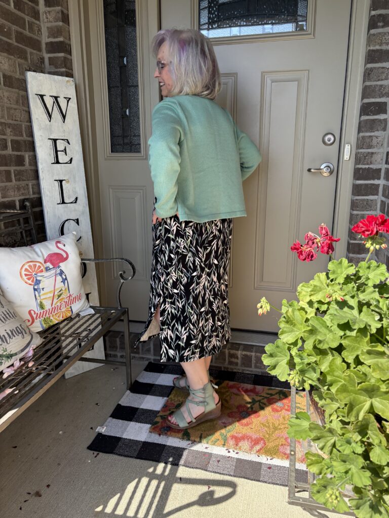 I was in J Jill a few weeks ago and spotted this Wearever V-Neck Midi dress on the sale rack. I have learned (sort of) to wait for something to go on sale at J Jill. Once it’s on sale, they usually offer an additional 30-40% off the ticketed price. I’m not sure how much I paid for this dress, but it was considerably less than the original price of $119. When you play this game, you also run the risk that the item will sell out before you can nab it on sale. If that happens, I always figure it was just not meant to be. I picked up the jade colored lady jacket sweater at J Crew Factory earlier this spring. I wonder why they dropped the Mercantile thing. Ours was a Factory, then changed to a Mercantile, and is now a Factory again. Anyway, I was proud of myself for not going to my default of a denim jacket!