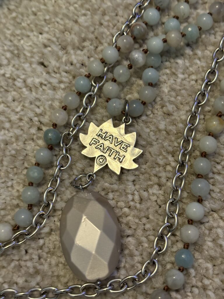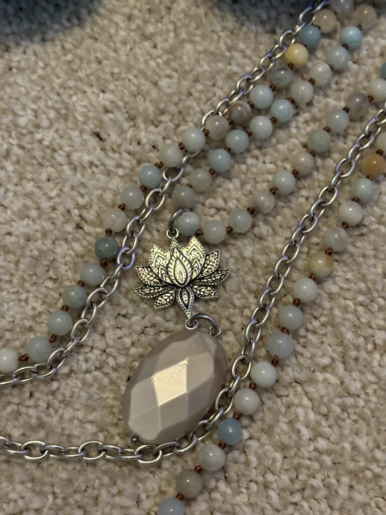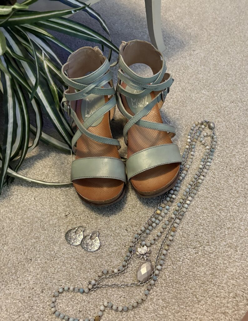 I love these Shay sandals from Miz Mooz. I was looking at them on my foot and noticed the arch of the sandal perfectly follows the arch of my foot. I know that sounds weird, but what I mean is they’re very supportive of my arches. I recently discovered Katia Designs (probably an ad on Instagram). This multi-strand necklace is called the Have Faith Lotus Amazonite Long Chain Fusion Necklace (that’s a mouthful). I just watched the video on the website, and there are a couple other ways to wear it! I do have a code, MARSHA15, and you can get 15% off your entire order. I think this necklace has almost every color of the dress in it. The earrings are old and from J Jill.