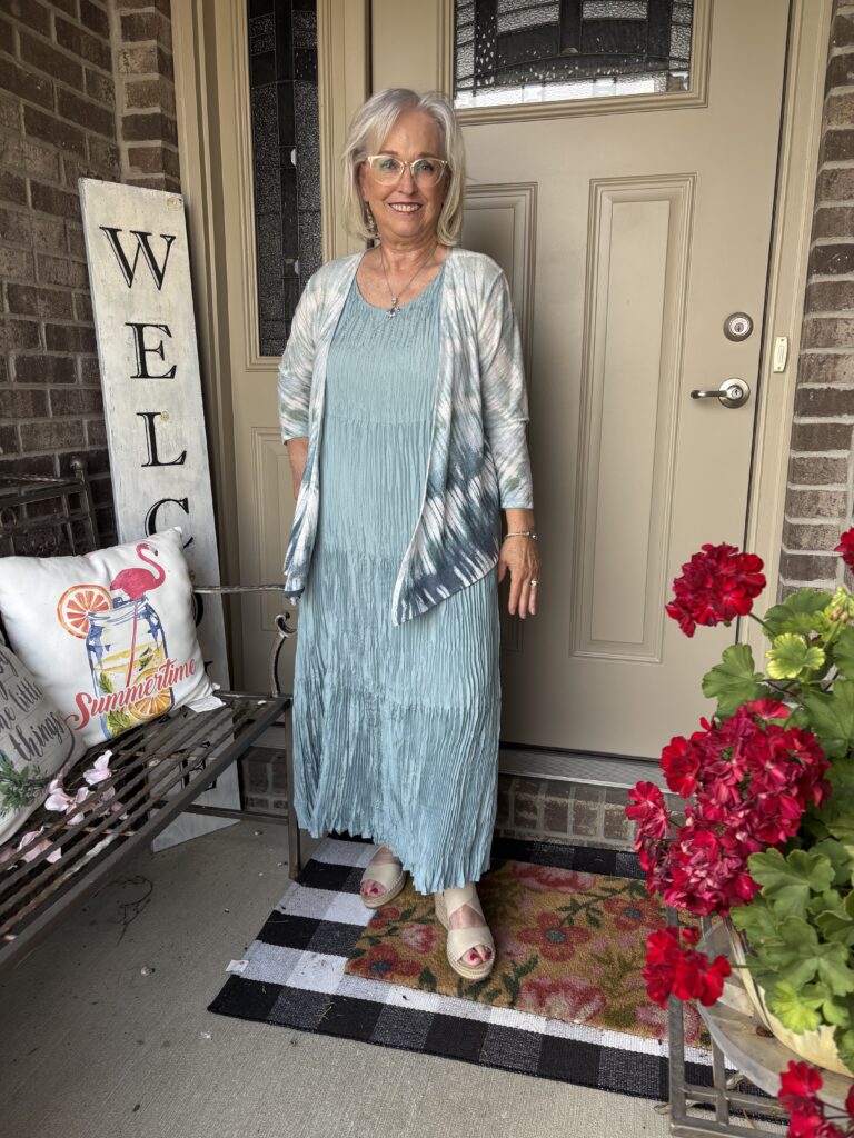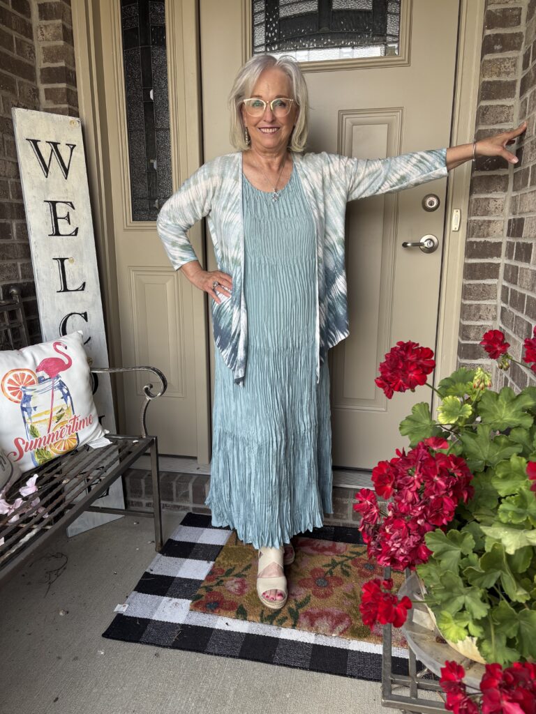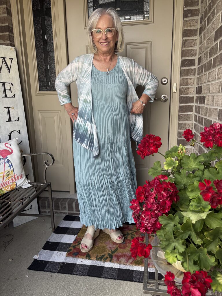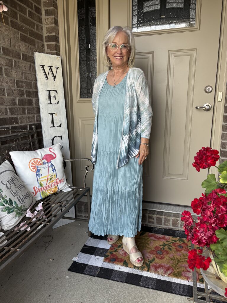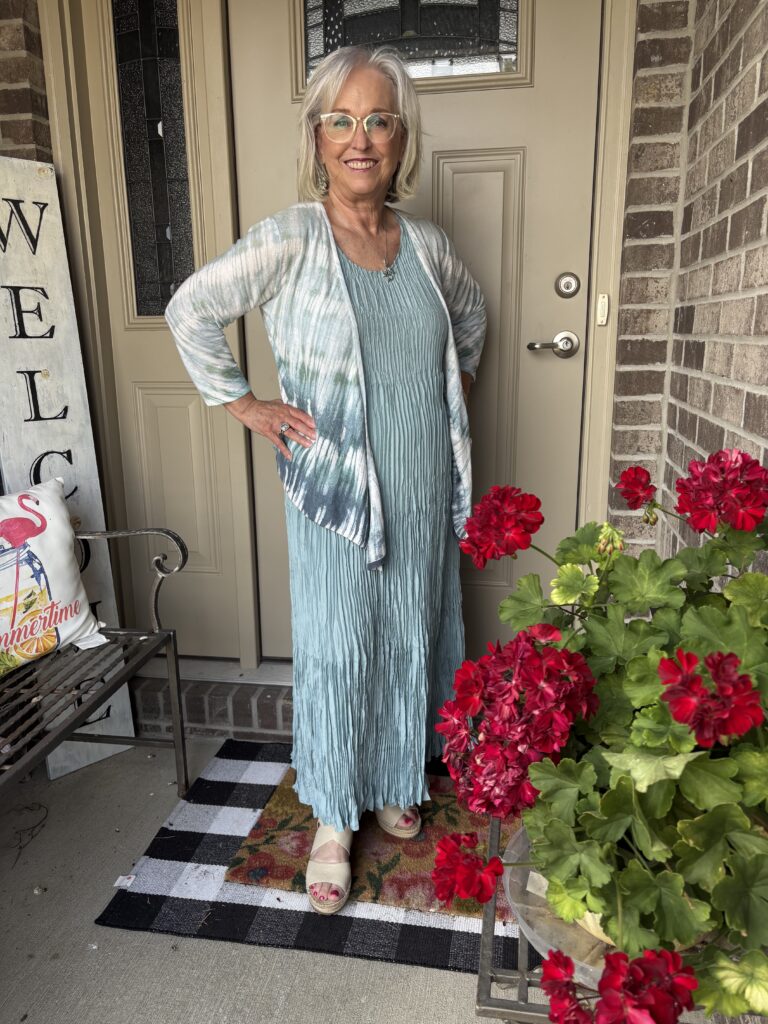 Eileen Fisher had a sale this summer, and I picked up another of these Crushed Silk Tiered Dresses. This is the seafoam color which I absolutely love. I know tiered dresses are supposed to be going out of style, but I think this has a classic look that I’ll wear for a long, long time. I added an old Nic + Zoe sweater. This is one of those four way cardigans. It has buttons at the bottom of each side. You can wear it open, button it so that it crosses in front of you, tie it, or knot the sides. I was amazed at how closely the blues matched. I think you can tell, from the photos, I felt amazing in this outfit.