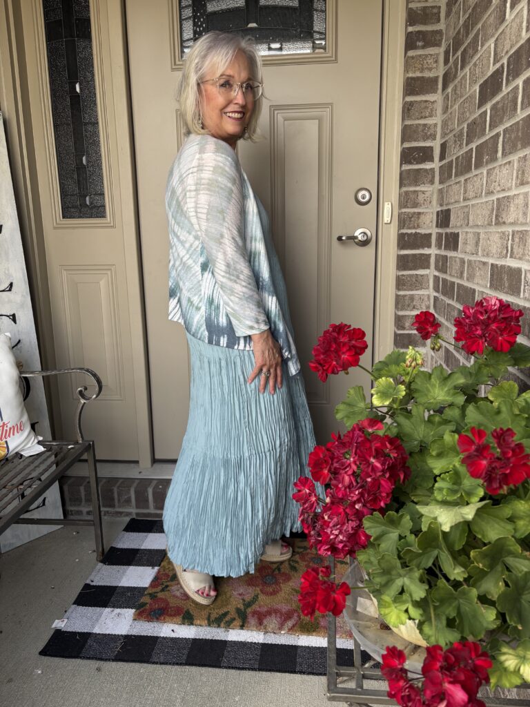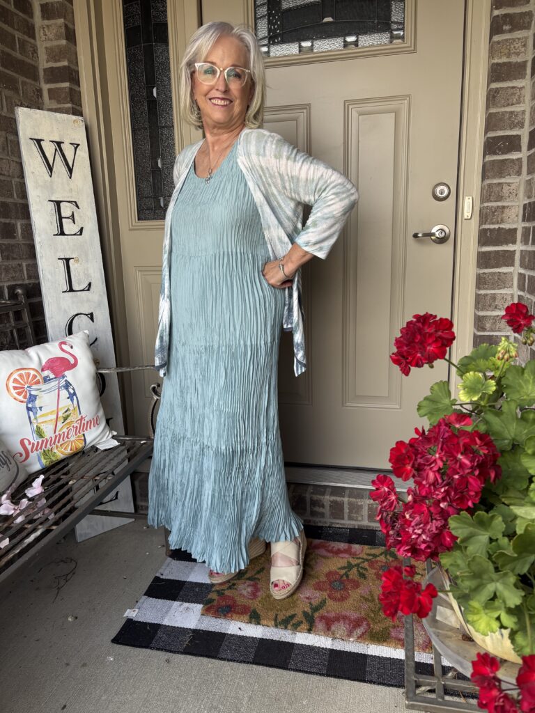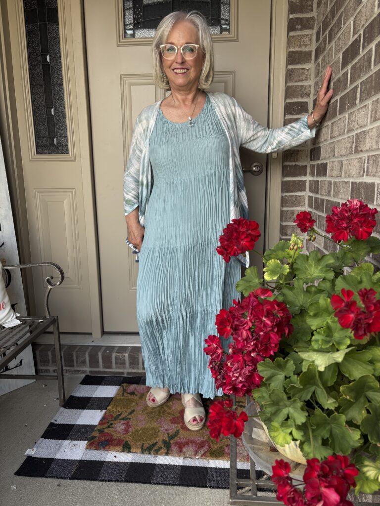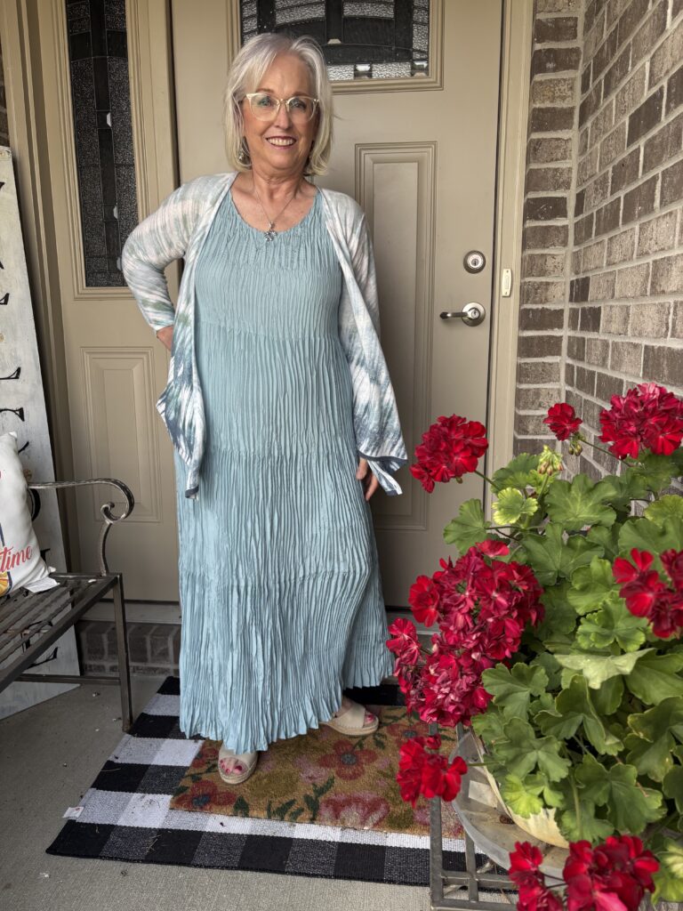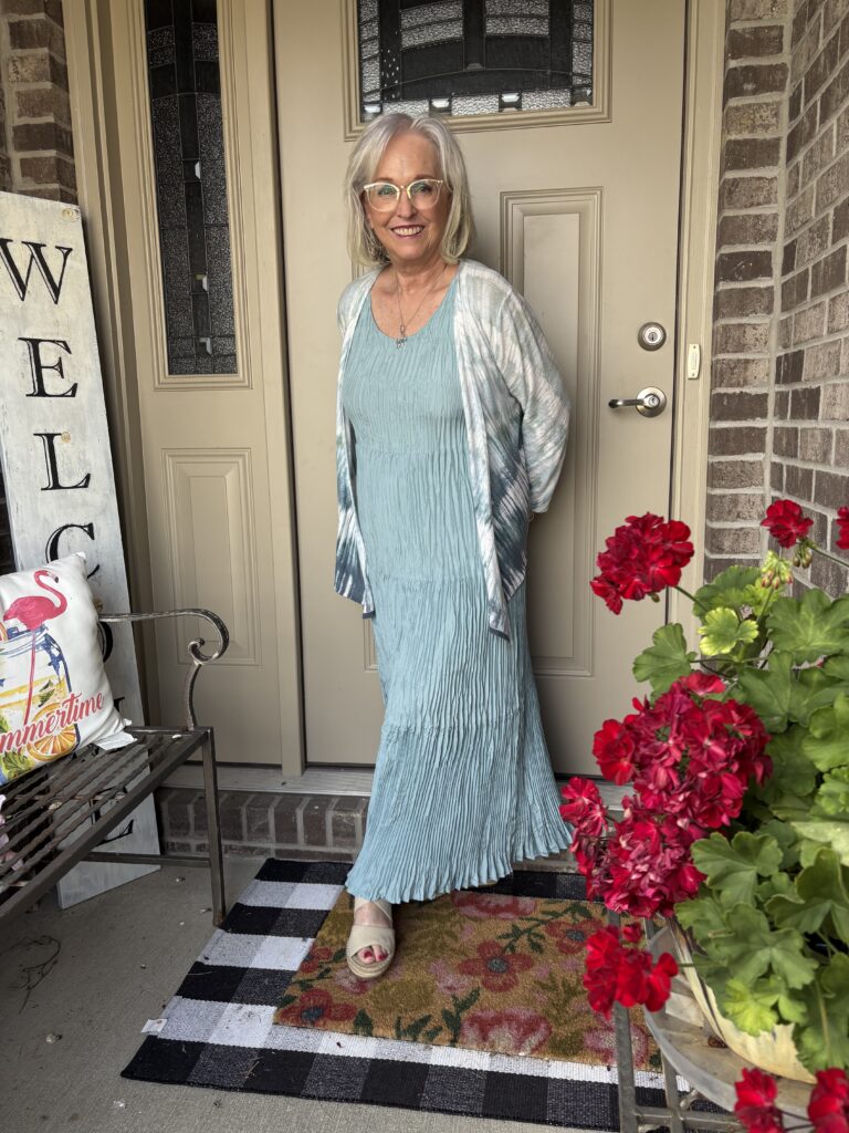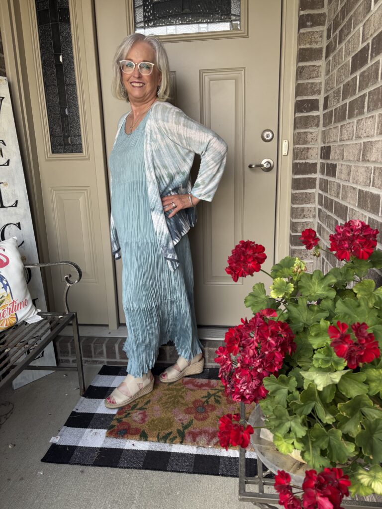 Eileen Fisher had a sale this summer, and I picked up another of these Crushed Silk Tiered Dresses. This is the seafoam color which I absolutely love. I know tiered dresses are supposed to be going out of style, but I think this has a classic look that I’ll wear for a long, long time. I added an old Nic + Zoe sweater. This is one of those four way cardigans. It has buttons at the bottom of each side. You can wear it open, button it so that it crosses in front of you, tie it, or knot the sides. I was amazed at how closely the blues matched. I think you can tell, from the photos, I felt amazing in this outfit.