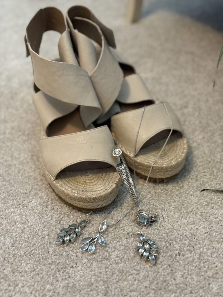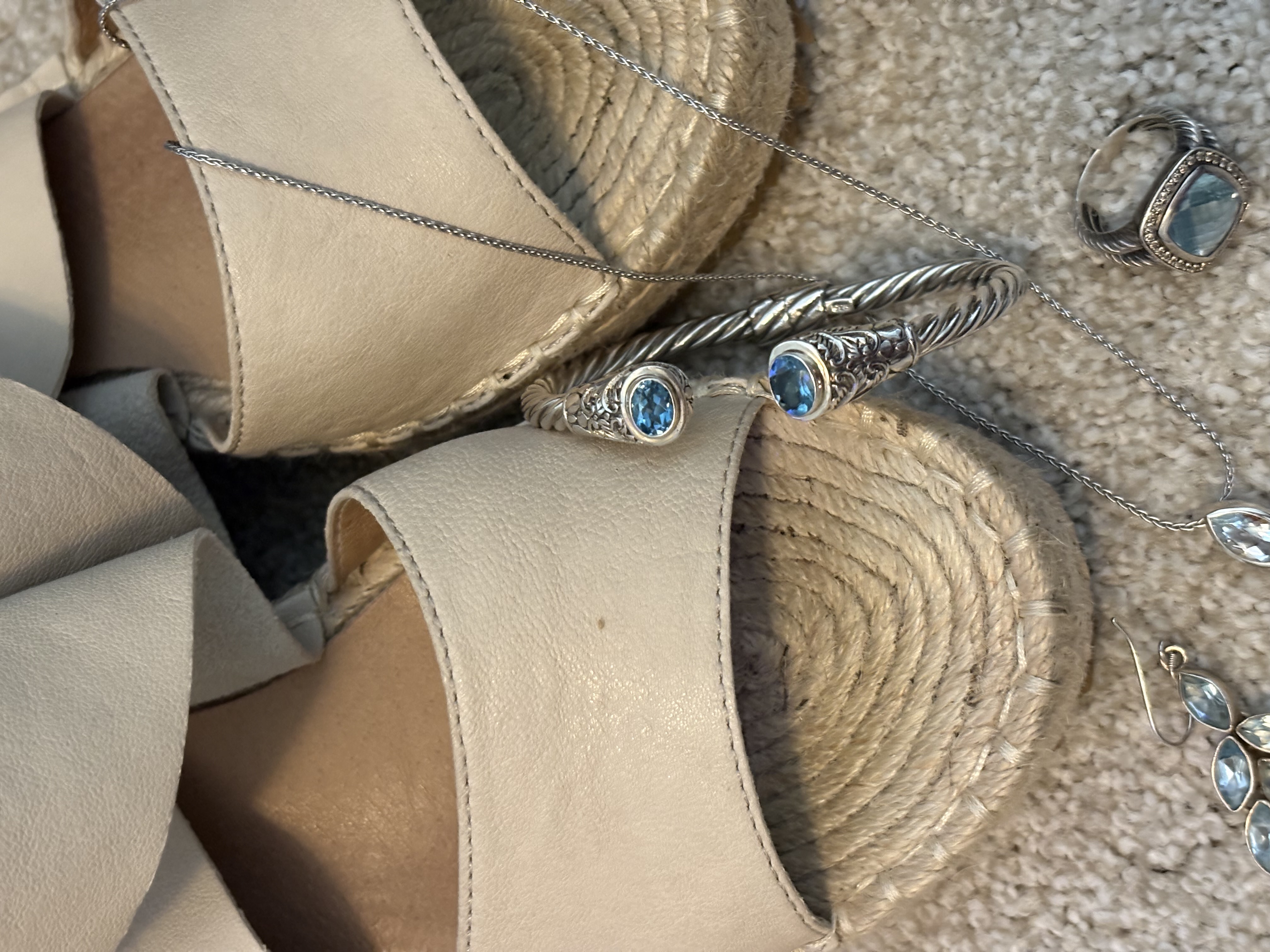 This was an Eileen Fisher kinda day! These Willow sandals are perfect for giving tours. They are lightweight, give me a little height, and are so daggone comfortable. I went all matchy-matchy with my accessories. The earrings are blue topaz and were bought in my old eBay jewelry shopping days. The ring is my first David Yurman piece. Nigel bought it for me for our anniversary years and years ago. The necklace and absolutely gorgeous bangle came from that neat little shop I discovered when out with a neighbor one Saturday. I can’t remember the name of the shop, though!