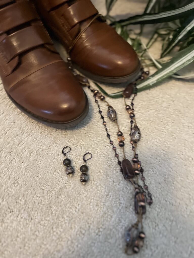 These Brandy colored Leighton boots from Miz Mooz were a splurge, but I wear them quite often. They were comfortable right out of the box. I haven’t even put my orthotics in them. They are just that good. The leather is like buttah! The earrings and necklace are an early fall purchase from J Jill. Is there brown in my outfit? Nope, not at all! But, there’s something organic about the stones which seems to work with the dress and cardigan.