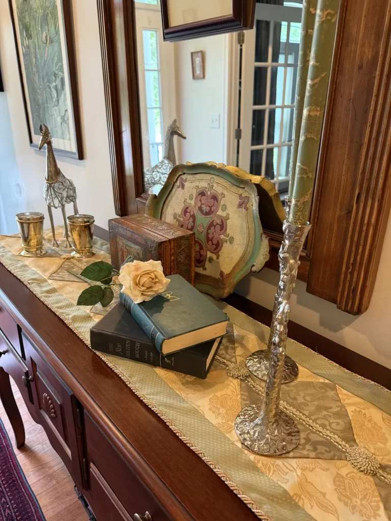 Loved the beautiful dress you showed…so much fine detail. Hope you are staying cool inside. It’s very hot and humid here, too and seems like we are always watering. Summer! Thanks so much for the feature for the Renaissance entryway. It was quite fun to put together. Wishing you a wonderful week.