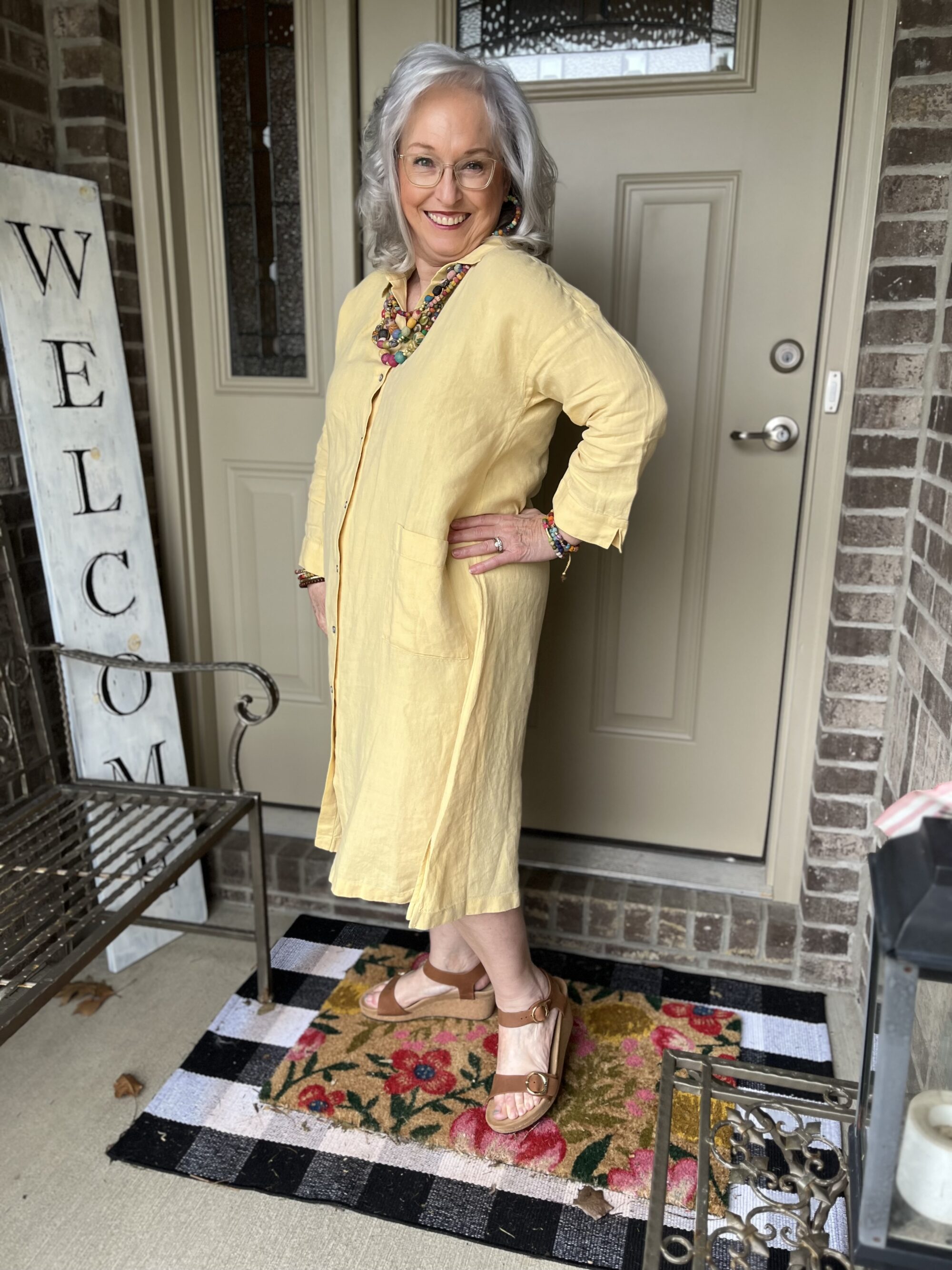 15. What a great dress, Marsha! This color is gorgeous on you. I will call it butter-custard! I absolutely love that necklace! It reminds me of the one I got at April Cornell in Burlington. Isn’t it so nice to shop in places that make you feel special? I have a similar relationship with the ladies in my local Torrid. Your Birkenstocks are super cute! I only have the traditional flat ones which are in my regular shoe size. I find them maybe a little wide but not too long. I usually wear socks with mine though! Fun post, my friend!